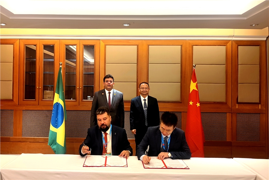 會議最后,在拉斐爾與張超群的見證下,皮奧伊州政府投資發展部亞洲區主任薩羅·卡斯特羅·布蘭科(Saullo Castelo Branco)與中廣核巴西公司董事長兼總裁姚志剛代表雙方簽署了合作備忘錄。